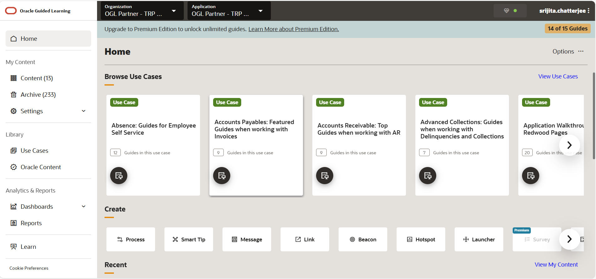 Leverage AI and automation to accelerate guide creation and tailor them to specific roles. Use AI to generate content suggestions for messages and take advantage of automation tools like Quick Guide Builder, Simulations, Intelligent Recommendations, and Automated Machine Translations to streamline your Guided Learning experience. Create guides and recordings without manually selecting elements, and preview builds to review and ensure accuracy. Instantly apply translations using the Oracle Cloud Infrastructure Language AI service. Seamlessly integrate Oracle Guided Learning into any web page, application, or chatbot.