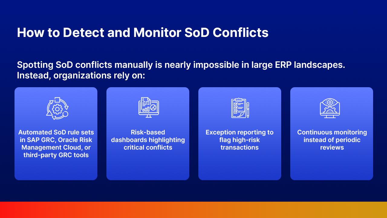 Spotting SoD conflicts manually is nearly impossible in large ERP landscapes. Instead, organizations rely on: